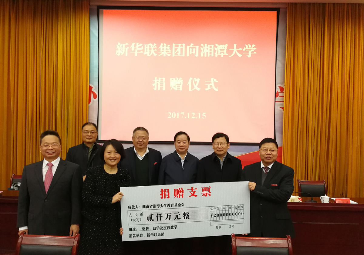 繼捐贈中南大學、湖南第一師范學院和北京外國語大學之后,新華聯集團又向湘潭大學捐贈2000萬元用于獎教助學。12月15日上午,捐贈儀式在湘潭大學逸夫樓第一報告廳舉行。新華聯集團董事局主席兼總裁傅軍與湘潭大學黨委書記黃云清、校長周益春,湘潭市委書記曹炯芳等出席捐贈儀式。