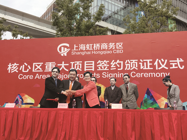 上海虹橋商務區黨組書記閔師林, 上海閔行區副區長吳斌以及虹橋商務區管委會副主任陳偉利、費小妹, 上海新華聯總經理李金寶等共同見證了簽約儀式。